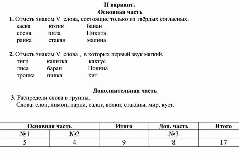 1. Отметь знаком V слова, состоящие только из твёрдых согласных.