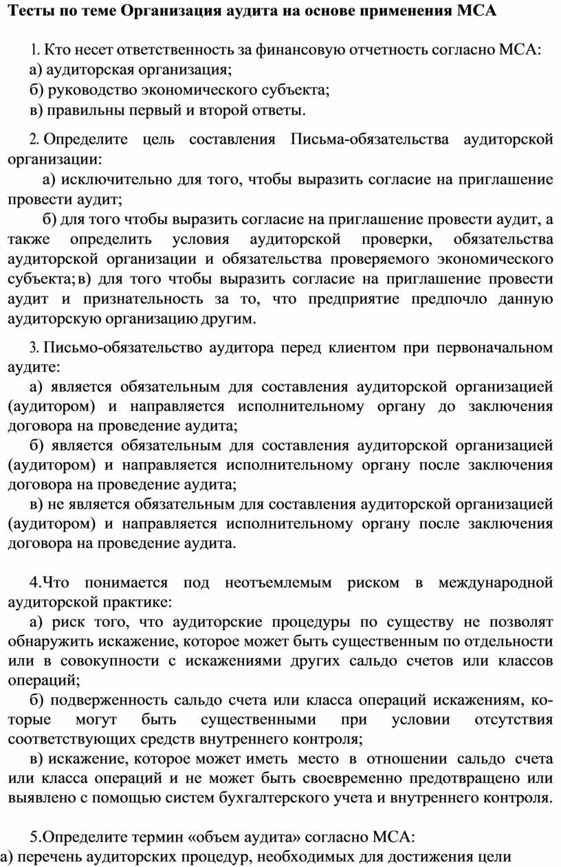 1. Кто несет ответственность за финансовую отчетность согласно МСА: а) аудиторская организация;