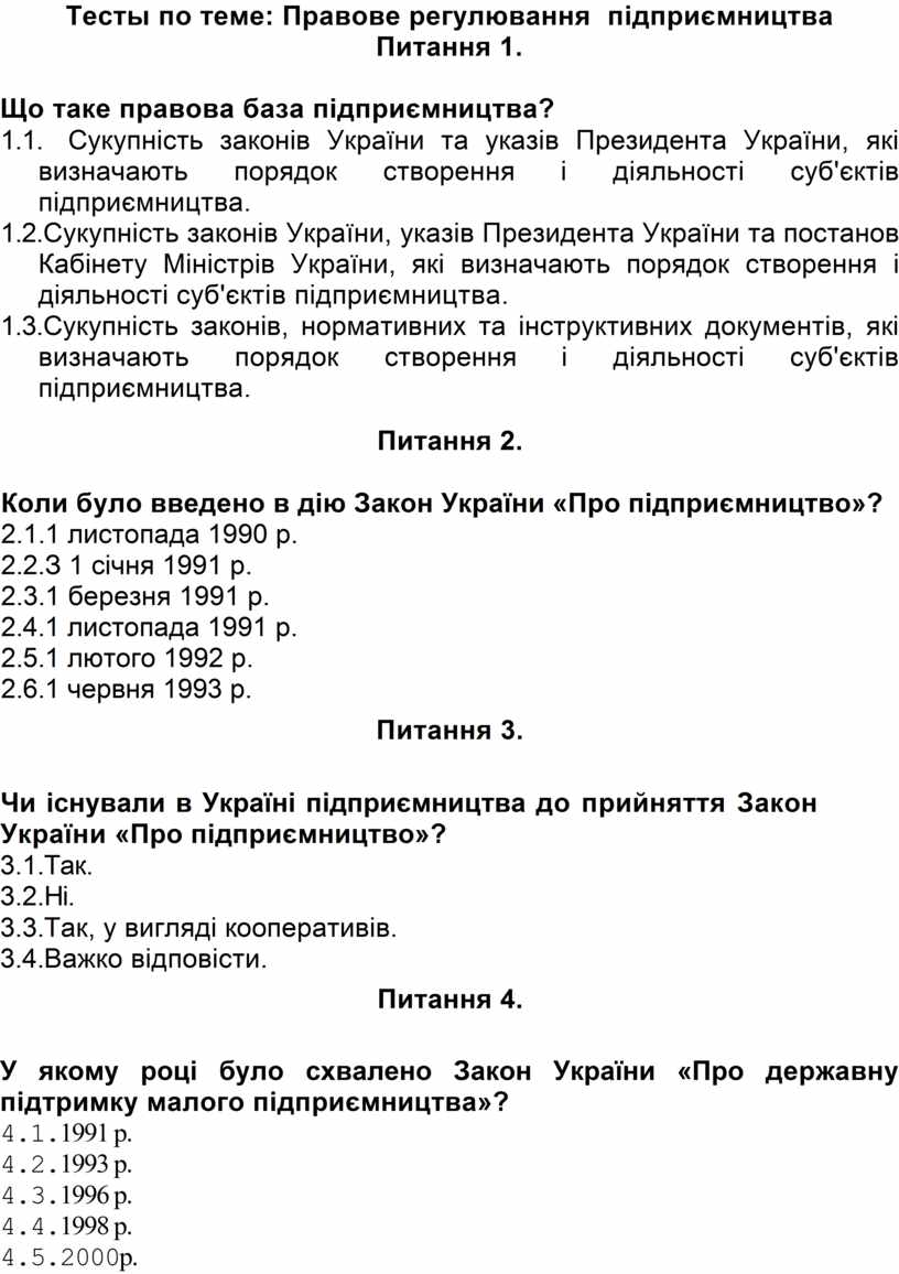 1.1. Сукупність законів України та указів Президента України, які визначають порядок створення і діяльності суб'єктів підприємництва.