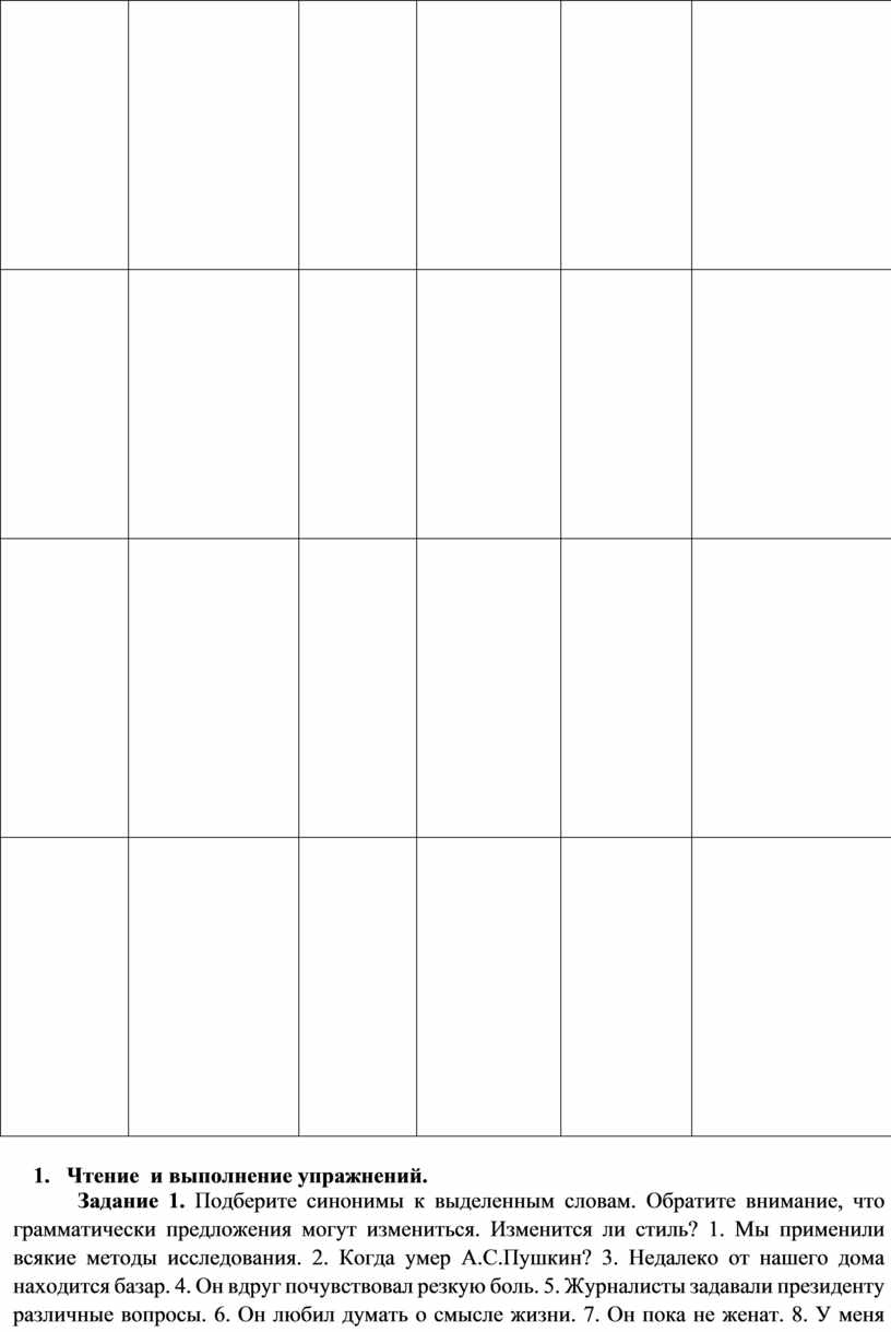 Задание 1. Подберите синонимы к выделенным словам. Обратите внимание, что грамматически предложения могут измениться. Изменится ли стиль? 1. Мы применили всякие методы исследования. 2. Когда умер А.С.Пушкин? 3. Недалеко от нашего дома находится базар. 4. Он вдруг почувствовал резкую боль. 5. Журналисты задавали президенту различные вопросы. 6. Он любил думать о смысле жизни. 7. Он пока не женат. 8. У меня появились непредвиденные проблемы. 9. В этом деле есть как хорошие, так и плохие стороны. 10. Никто не знает, где прячется этот человек. 11. Не надо тратить деньги на сувениры. 12. Надо починить папину машину. 13. Когда появилась жизнь на нашей планете? 14. Он кинул мяч в корзину, но промахнулся. 15. Старший брат отнял у младшего книгу. 16. Давай подарим маме фартук! 17. Порезанный палец надо перевязать. 18. Всю ночь придется не спать. 19. У бизнесмена украли машину. 20. Расскажите, что случилось.