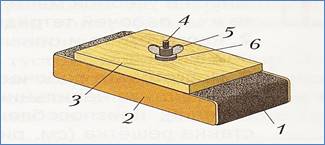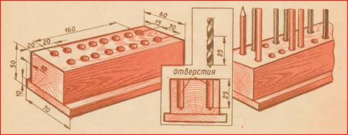 Выбрать готовые заготовки: доска размером 200х70х10 мм и брусок 200х60х50 мм. Проверить размеры. Разметить 16 отверстий у бруска (от торца 20 мм, через 20 мм друг от друга и от кромки 15 мм) и наколоть шилом или сделать лунки слесарным кернером. Установить ограничитель на 25 мм на сверло диаметром 15 мм (см. рис.). Закрепить брусок с боковыми прокладками из тонкой фанеры в машинных тисках сверлильного станка. Подготовить сверлильный станок к работе, вставить сверло в патрон. Спросить разрешения учителя, включить станок, проверить центровку сверла, не бьёт ли, просверлить 16 несквозных отверстий в бруске. Выключить станок. Раскрутить губки машинных тисков, снять брусок. Очистить станок, опилки смести щёткой-смёткой в совок. Сборка. Соединить доску с бруском на 4 гвоздика или самореза с потайной головкой. Зачистить мелкой наждачной бумагой подставку для свёрл, окрасить морилкой, покрыть масляным или бесцветным лаком на 3 раза. Сдать готовое изделие на проверку учителю. |