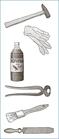 Гвозди, молоток, клещи (если гвоздь согнулся), саморезы, крестовая отвертка или шуруповерт. Шлифовальная шкурка, морилка, лаки, кисть, резиновые перчатки |