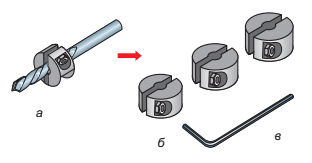 Упор (ограничитель), закреплённый на сверле: а – общий вид; б – переменные насадки; в – ключ