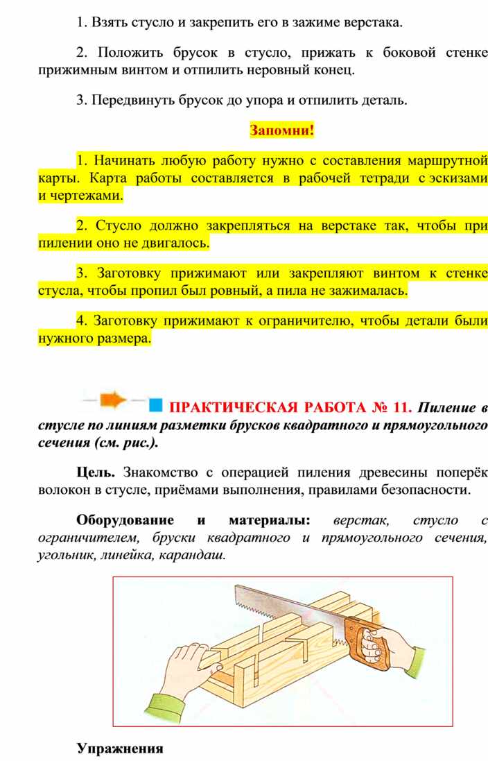 10. Установить и закрепить в зажимах заготовки древесины для пиления вдоль волокон, поперёк волокон, для строгания поочерёдно.