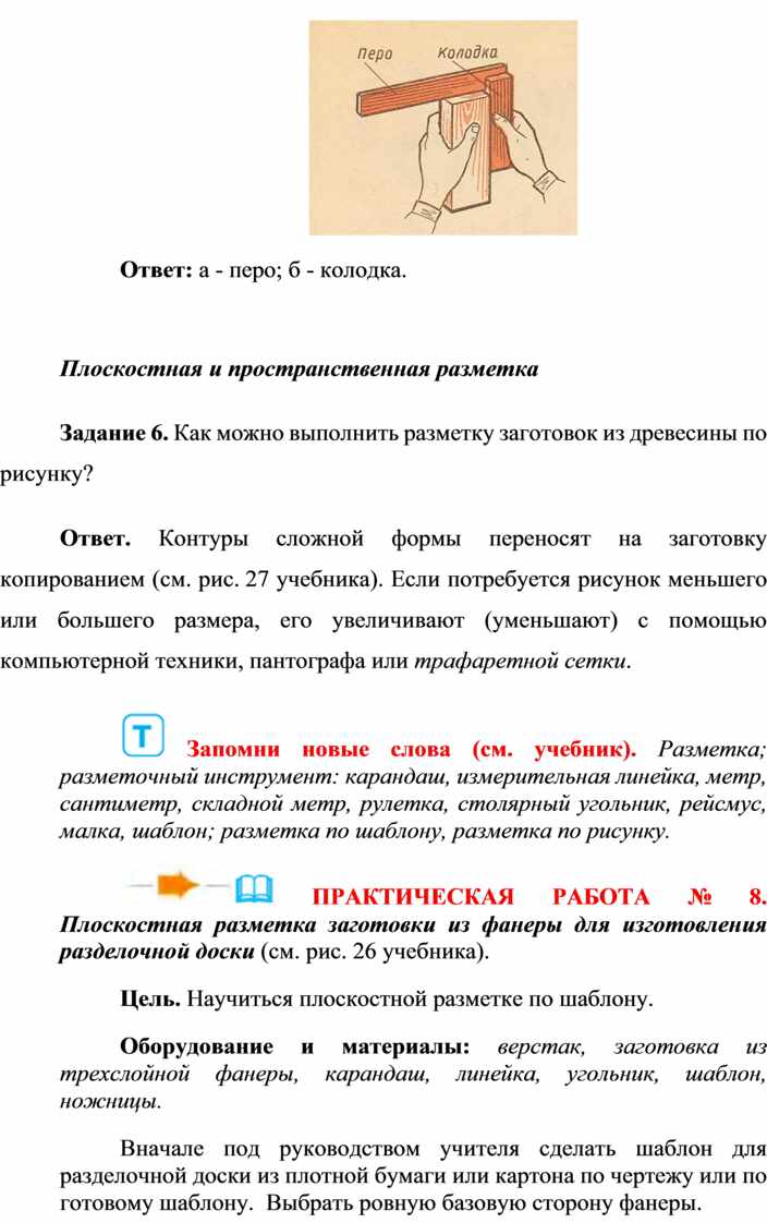 Оборудование, учебные пособия и материалы: сверлильный станок, электродрель, шуруповёрт, тиски, верстаки, ножовки, рубанки, мелкие гвозди или саморезы, картон, клей «Момент столярный», краски, морилки различных цветов, молотки, крестовые отвёртки, кисти, масляный лак; заготовки из древесины. Свёрла, ограничители свёрл, ключ к ограничителям, мультимедийные презентации, ПК, учебник, рабочие тетради. Маршрутные и технологические карты. Образец изделия (см. рис. 70 учебника и в тетради ниже).