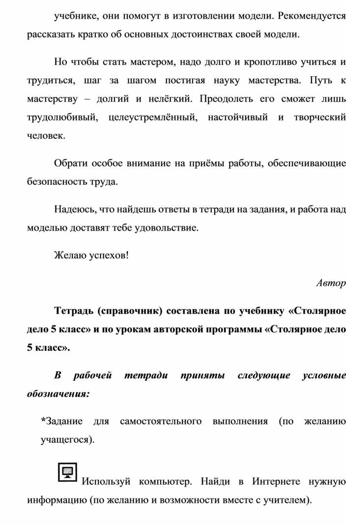 Тетрадь (справочник) составлена по учебнику «Столярное дело 5 класс» и по урокам авторской программы «Столярное дело 5 класс».