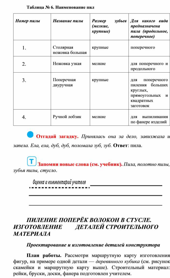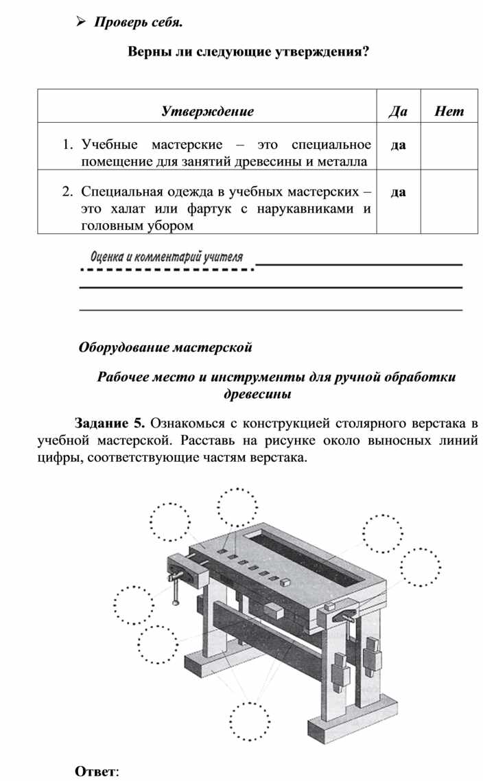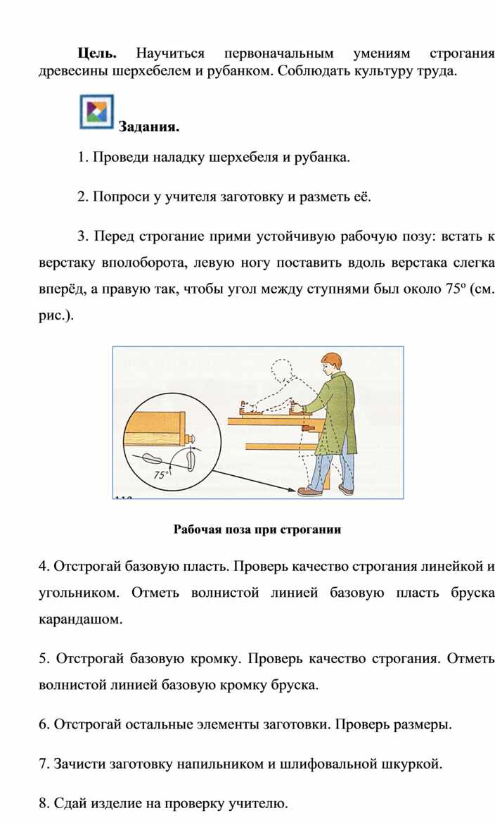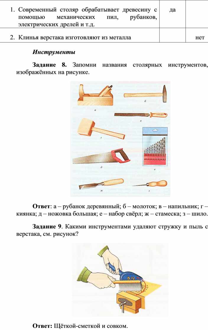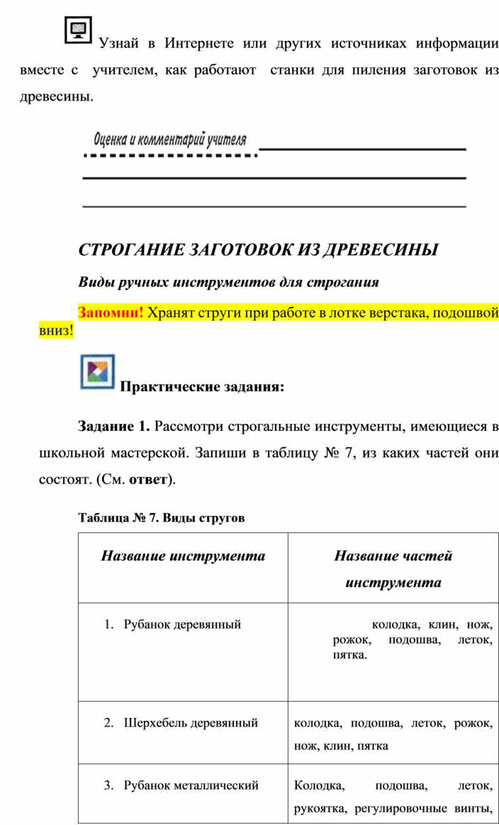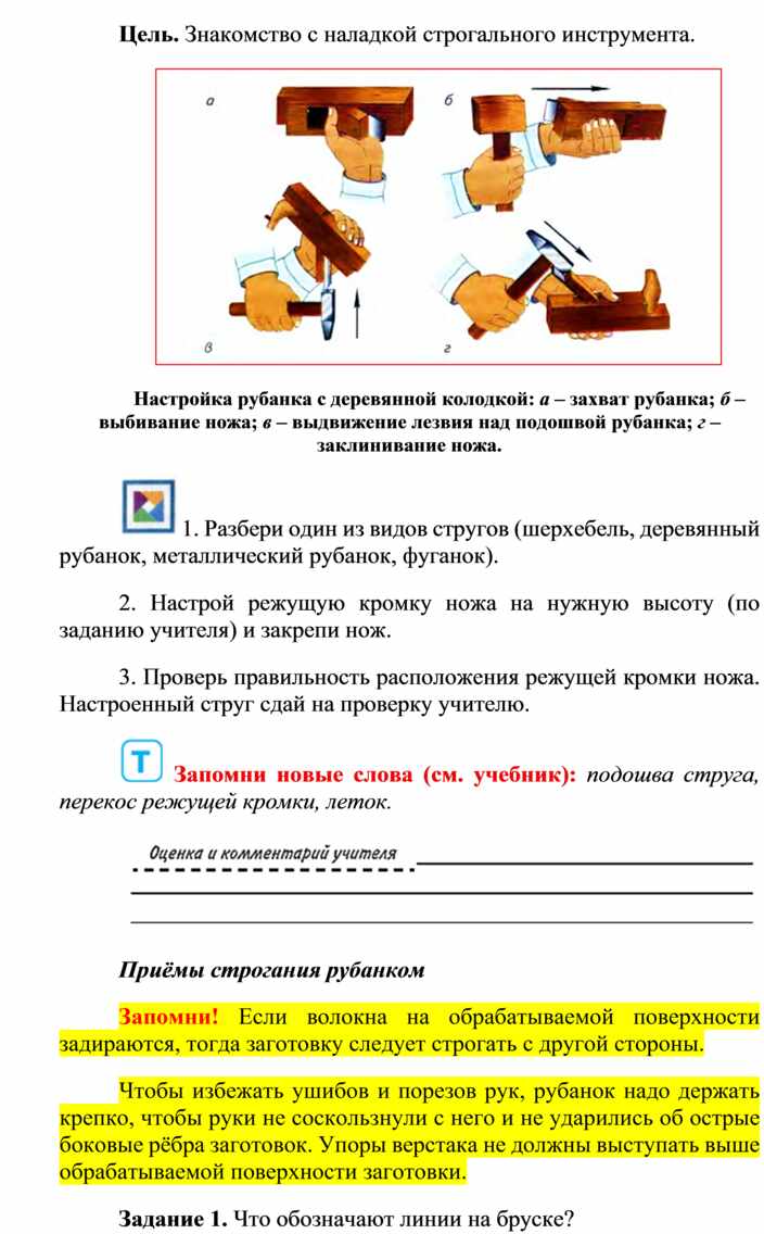 Оборудование и материалы: выставка работ учащихся V класса; верстак столярный, винтовые зажимы столярного верстака; заготовка из древесины длиной 200…300 мм; гребёнка, клинок, комплект инструмента.