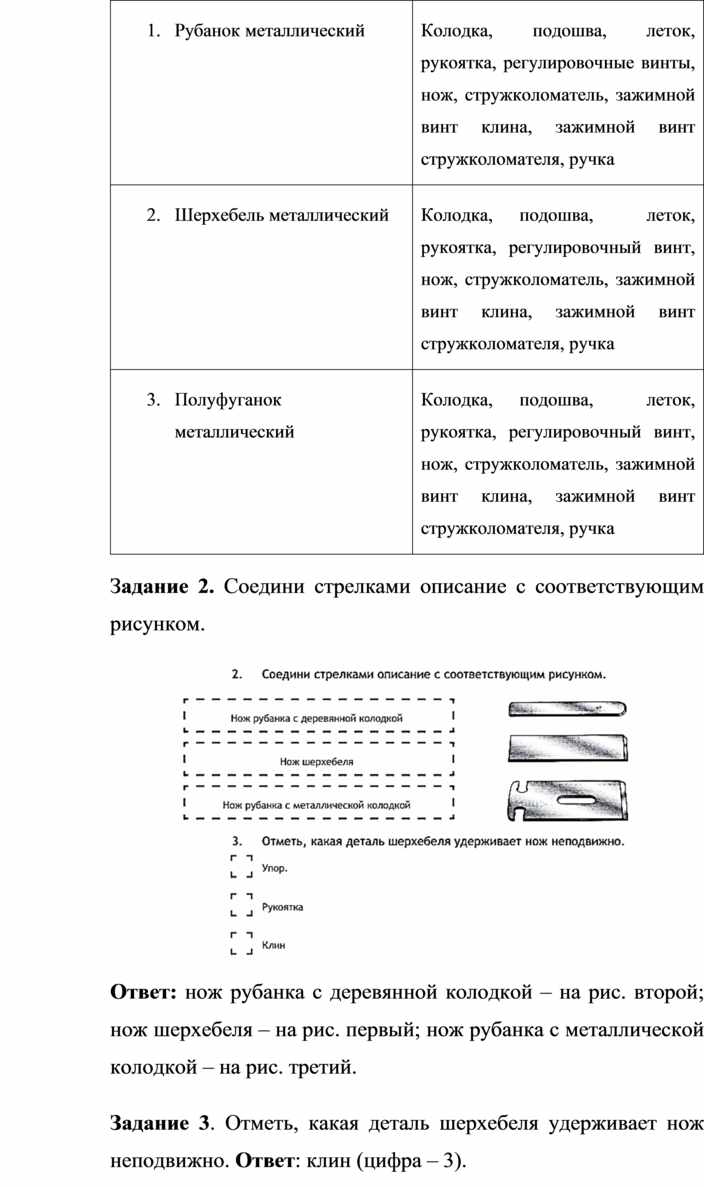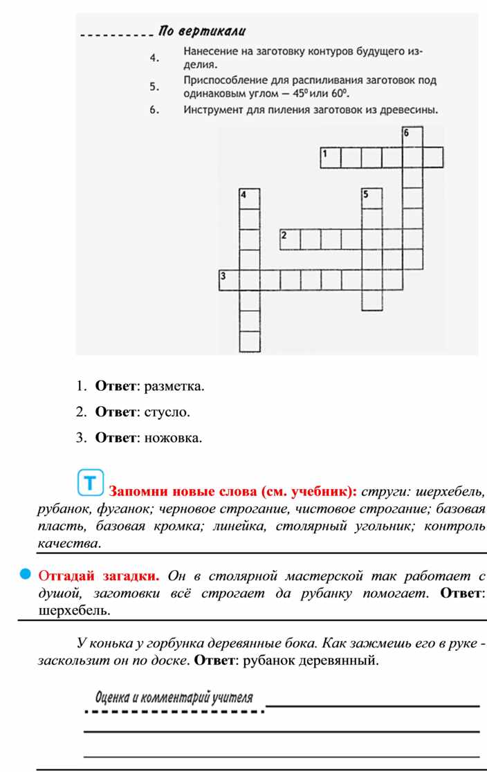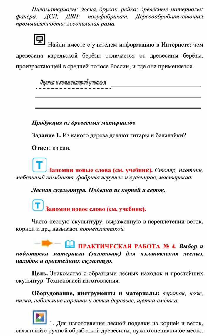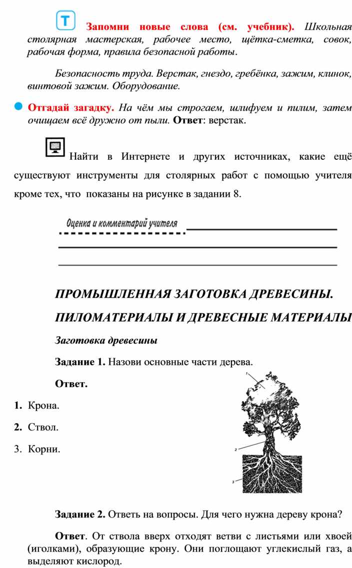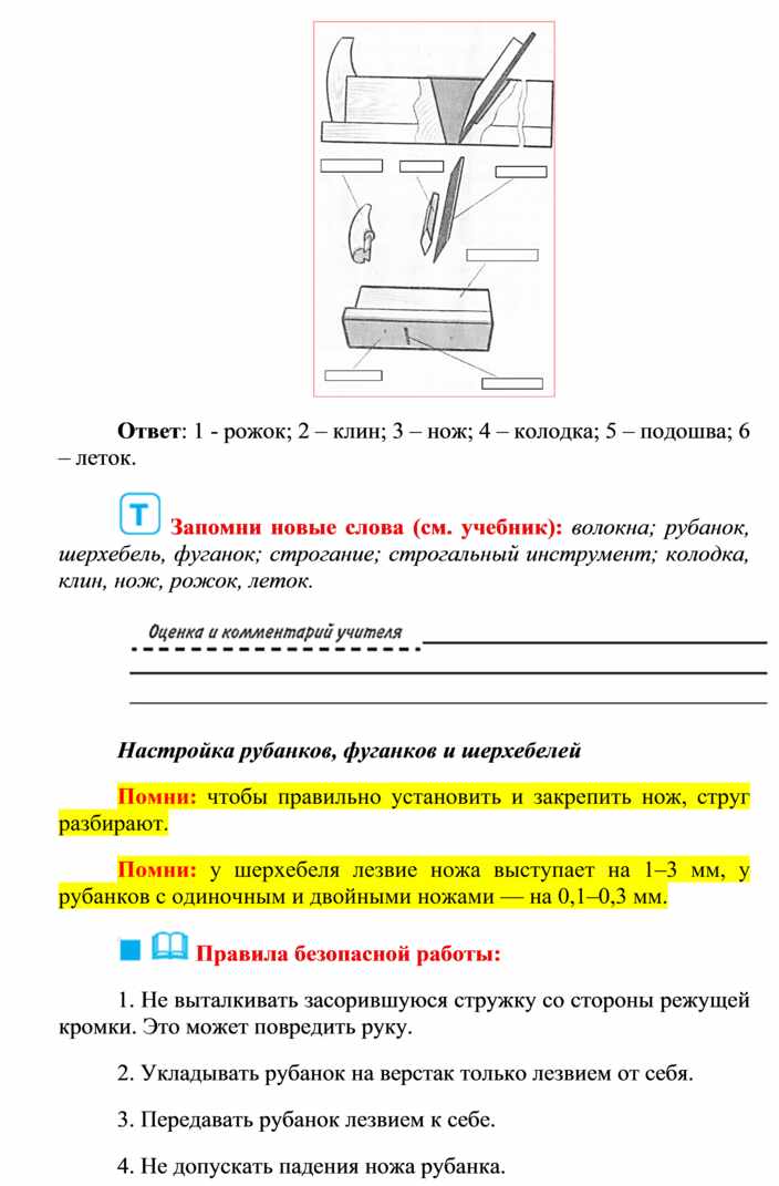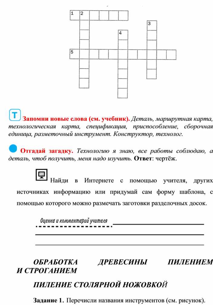Оборудование и материалы: выставка работ учащихся V класса; верстак столярный, винтовые зажимы столярного верстака; заготовка из древесины длиной 200…300 мм; гребёнка, клинок, комплект инструмента.