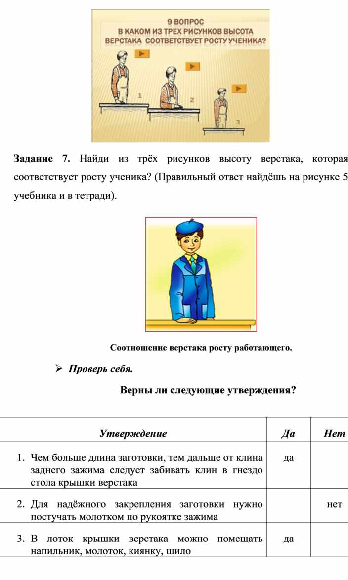 3. Определить соответствие высоты верстака (см. рис. 2 учебника) твоему росту вместе с учителем. При необходимости установить необходимую высоту с помощью регулировочных винтов (для комбинированных верстаков) (см. рис. 4 учебника) или ростовой подставки (для столярных верстаков).