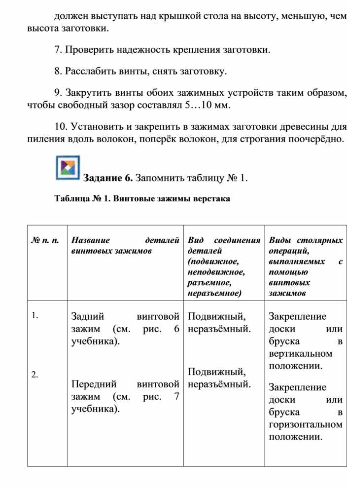 4. Закрепить заготовку с помощью заднего зажимного устройства верстака и проверить надежность её крепления (см. рис. 6 учебника).