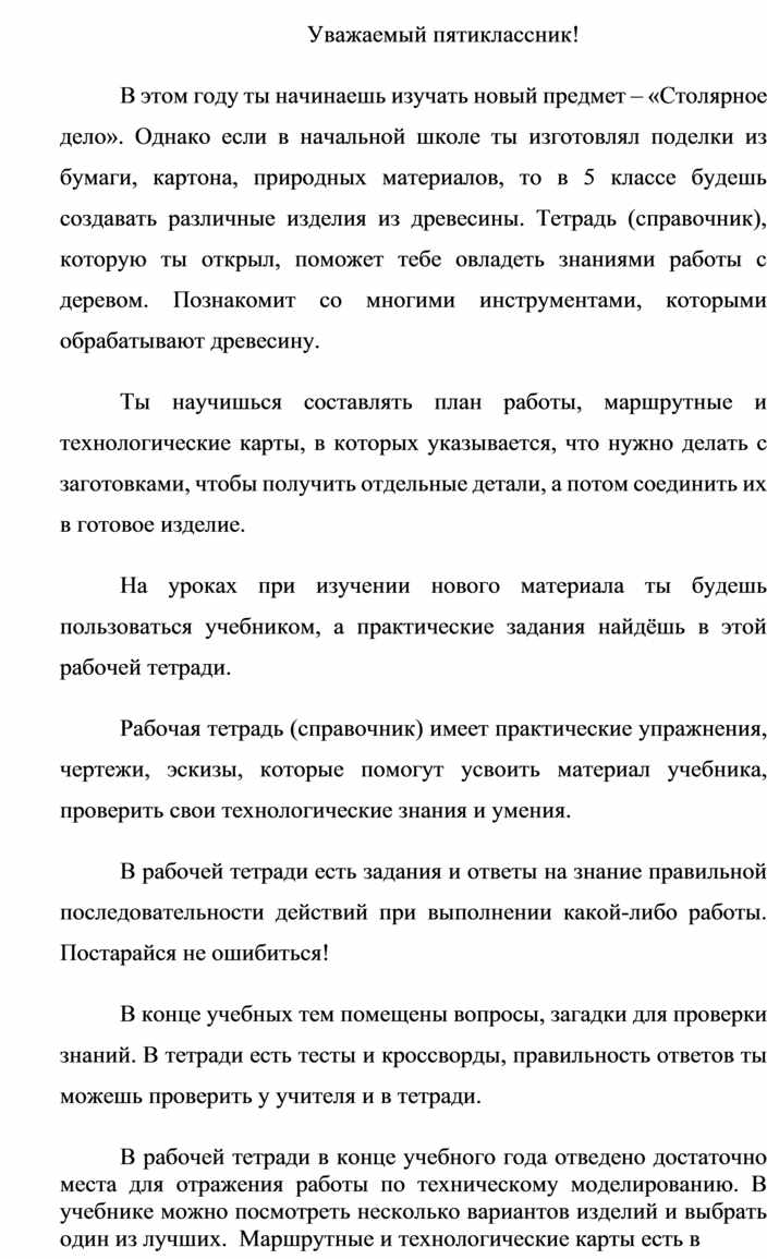 В этом году ты начинаешь изучать новый предмет – «Столярное дело». Однако если в начальной школе ты изготовлял поделки из бумаги, картона, природных материалов, то в 5 классе будешь создавать различные изделия из древесины. Тетрадь (справочник), которую ты открыл, поможет тебе овладеть знаниями работы с деревом. Познакомит со многими инструментами, которыми обрабатывают древесину.