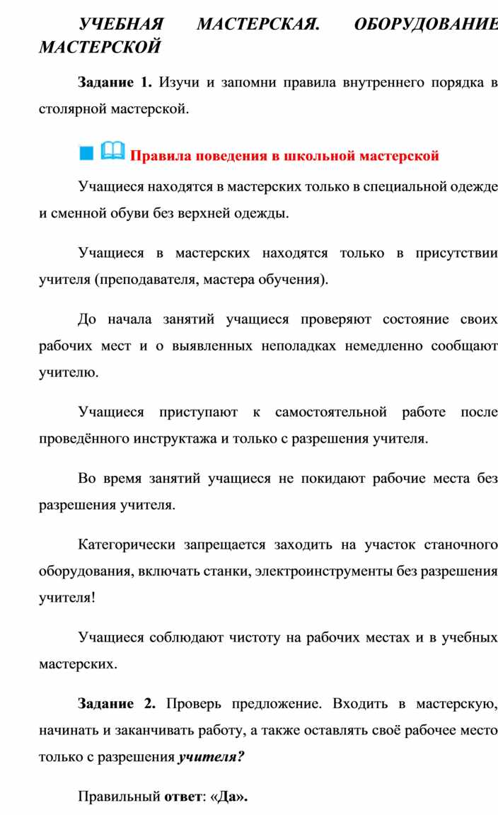 Задание 2. Проверь предложение. Входить в мастерскую, начинать и заканчивать работу, а также оставлять своё рабочее место только с разрешения учителя?