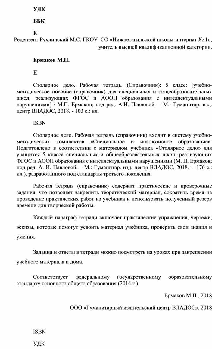 Ермаков М. П. Трудовое обучение. Столярное дело: 5 класс: [методическое пособие для специальных и общеобразовательных школ, реализующих ФГОС и АООП образования обучающихся с интеллектуальными нарушениями] / М. П. Ермаков; под ред. А. И. Павловой. - М.: Гуманитарный изд. центр «ВЛАДОС», 2018.