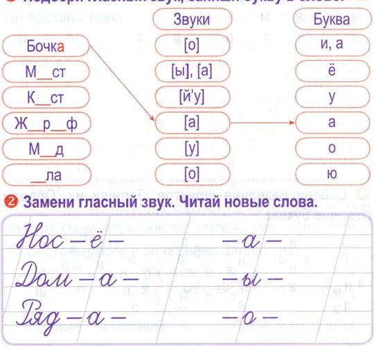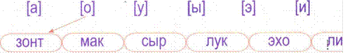 О Слушай гласные звуки. Соедини стрелкой звуки с подходящими словами.