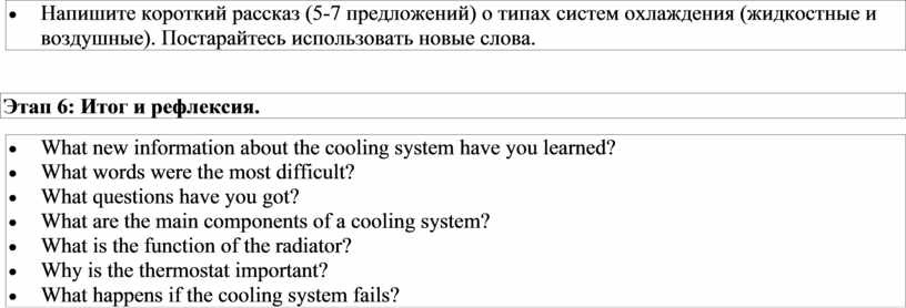 · Напишите короткий рассказ (5-7 предложений) о типах систем охлаждения (жидкостные и воздушные). Постарайтесь использовать новые слова.