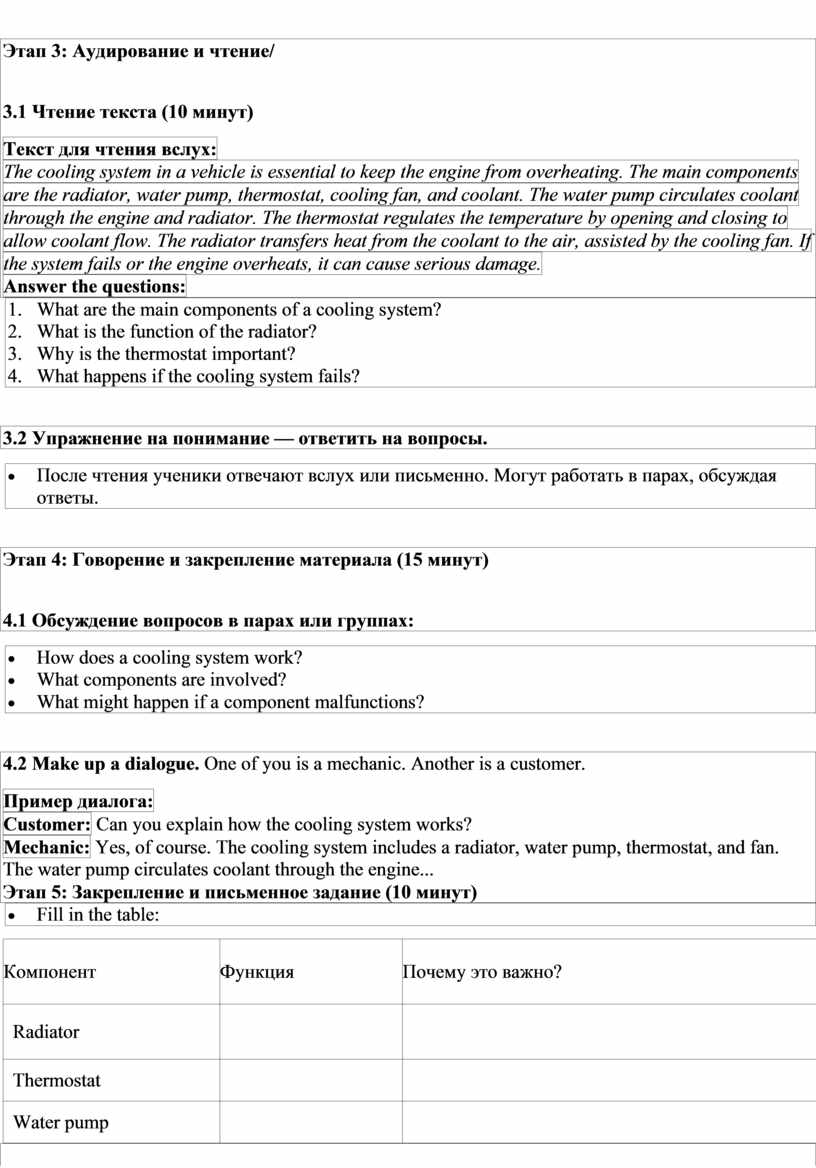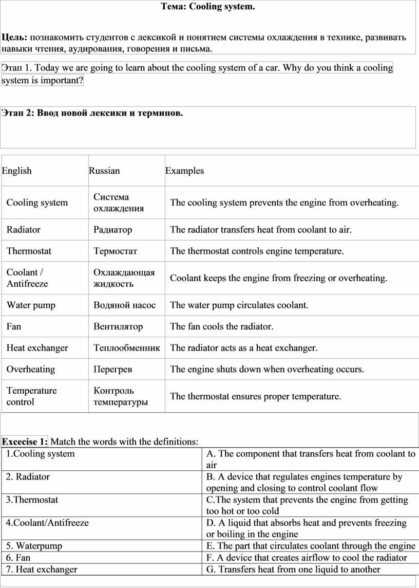 Цель: познакомить студентов с лексикой и понятием системы охлаждения в технике, развивать навыки чтения, аудирования, говорения и письма.