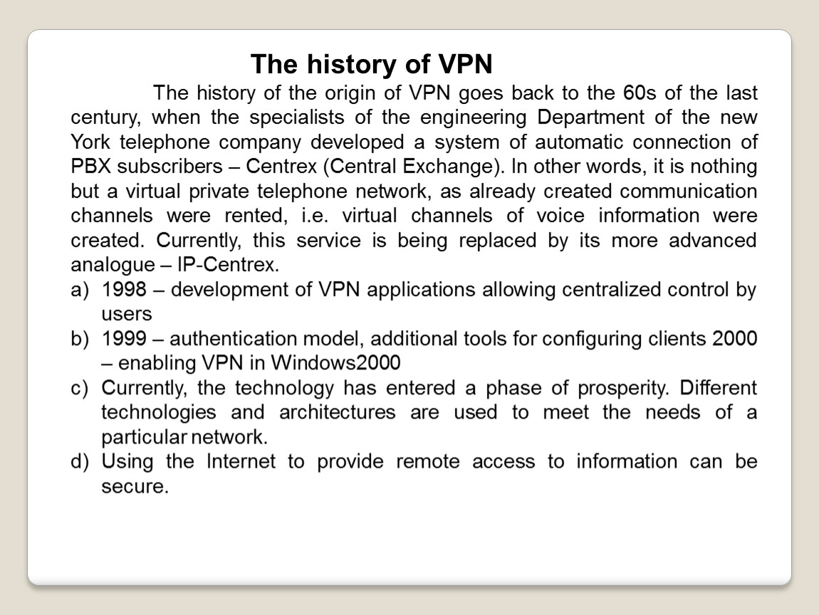 The history of the origin of VPN goes back to the 60s of the last century, when the specialists of the engineering Department of the new York telephone company developed a system of automatic connection of PBX subscribers – Centrex (Central Exchange). In other words, it is nothing but a virtual private telephone network, as already created communication channels were rented, i.e. virtual channels of voice information were created. Currently, this service is being replaced by its more advanced analogue – IP-Centrex.