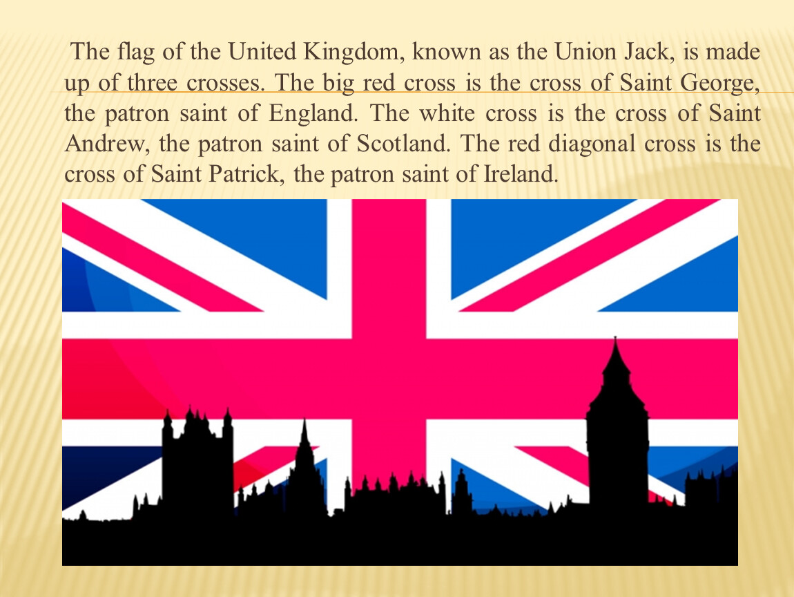 The flag of the United Kingdom, known as the Union Jack, is made up of three crosses. The big red cross is the cross of Saint George, the patron saint of England. The white cross is the cross of Saint Andrew, the patron saint of Scotland. The red diagonal cross is the cross of Saint Patrick, the patron saint of Ireland.