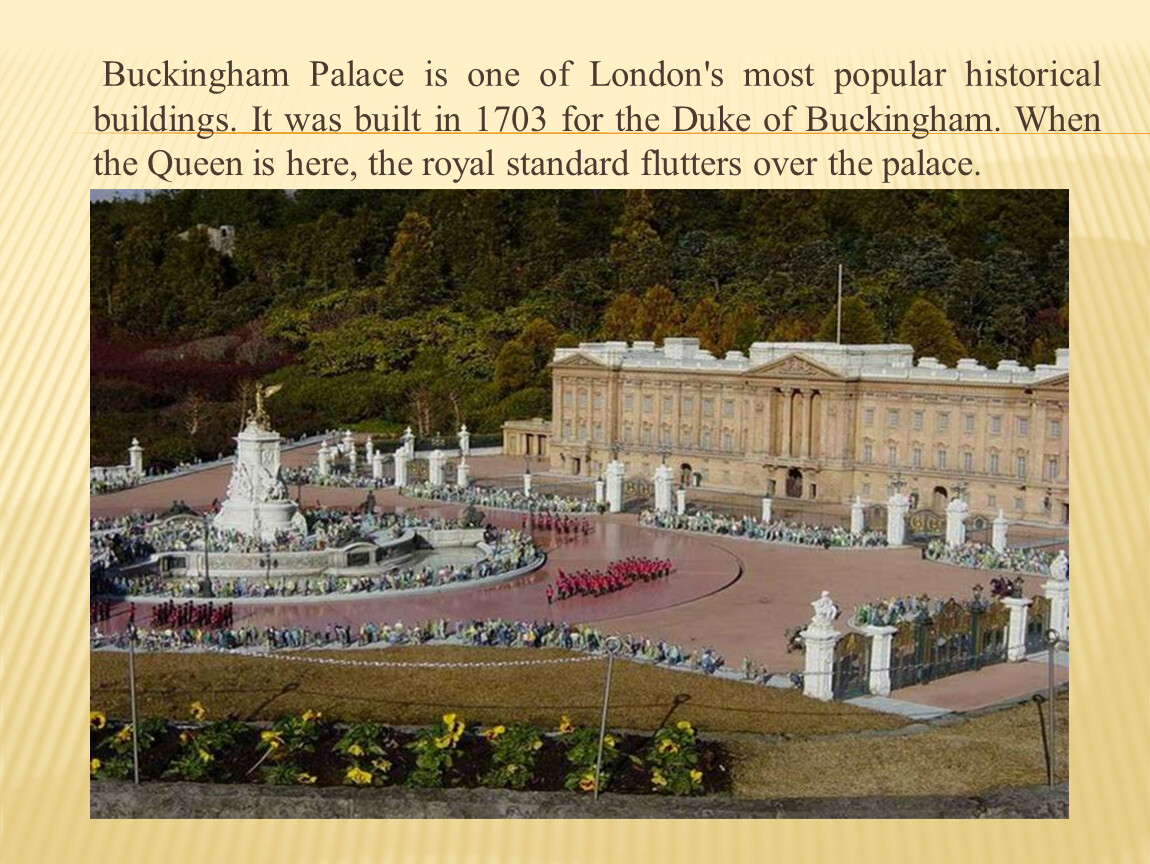 Buckingham Palace is one of London's most popular historical buildings. It was built in 1703 for the Duke of Buckingham. When the Queen is here, the royal standard flutters over the palace.