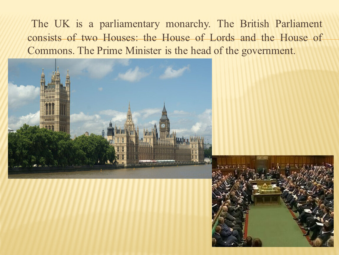 The UK is a parliamentary monarchy. The British Parliament consists of two Houses: the House of Lords and the House of Commons. The Prime Minister is the head of the government.