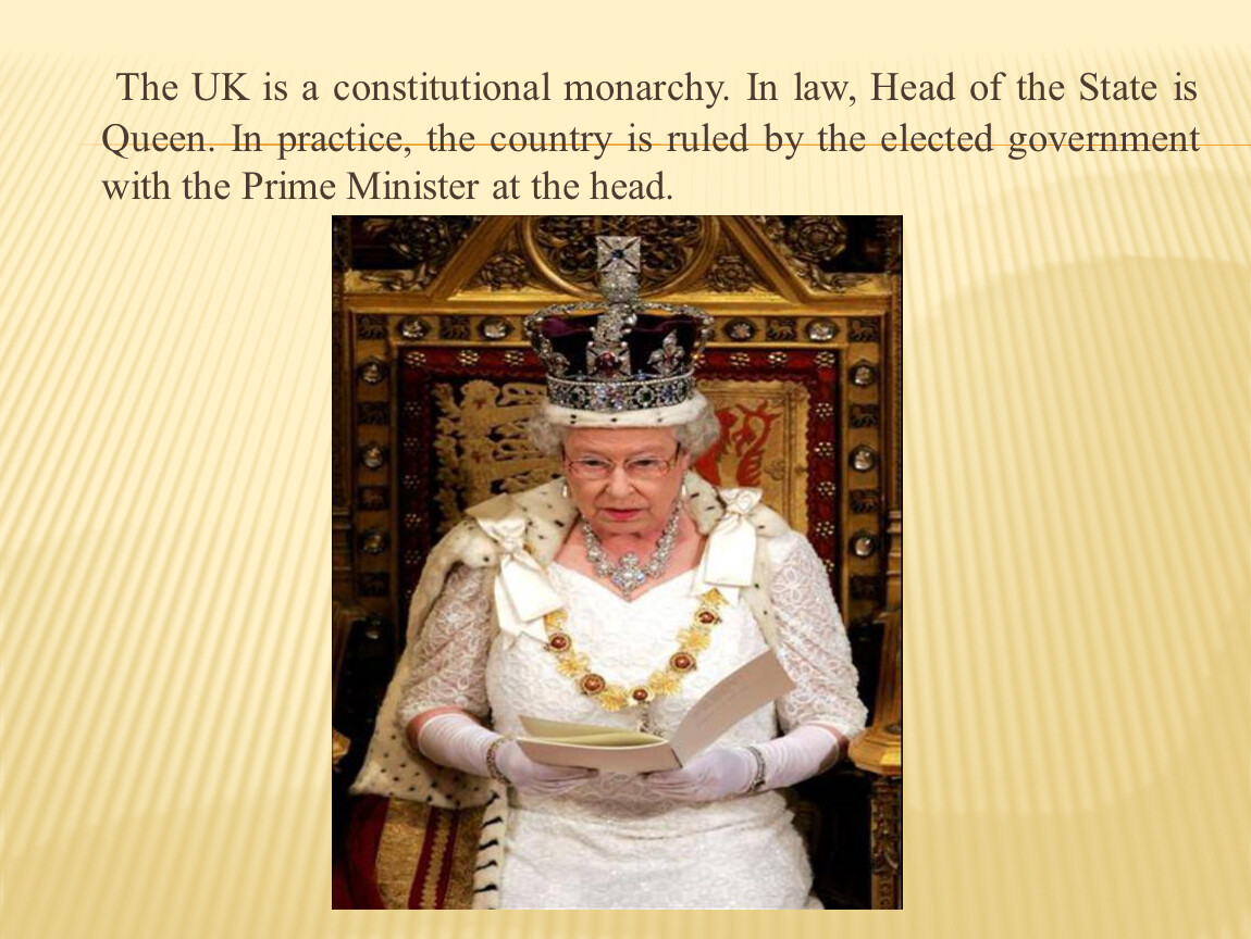 The UK is a constitutional monarchy. In law, Head of the State is Queen. In practice, the country is ruled by the elected government with the Prime Minister at the head.