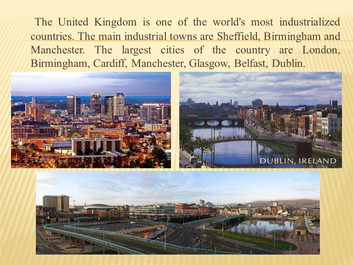 The United Kingdom is one of the world's most industrialized countries. The main industrial towns are Sheffield, Birmingham and Manchester. The largest cities of the country are London, Birmingham, Cardiff, Manchester, Glasgow, Belfast, Dublin.
