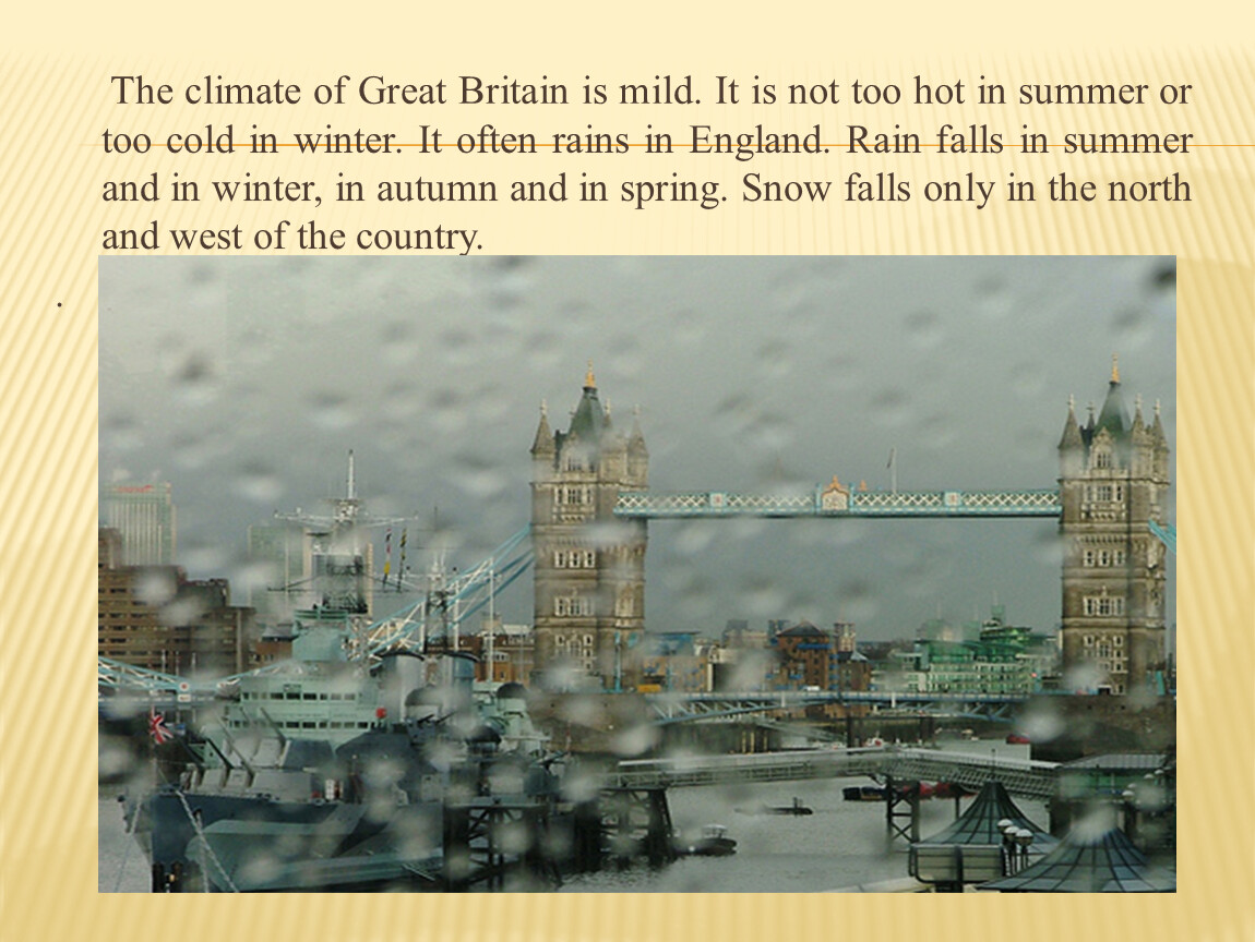 The climate of Great Britain is mild. It is not too hot in summer or too cold in winter. It often rains in England. Rain falls in summer and in winter, in autumn and in spring. Snow falls only in the north and west of the country.