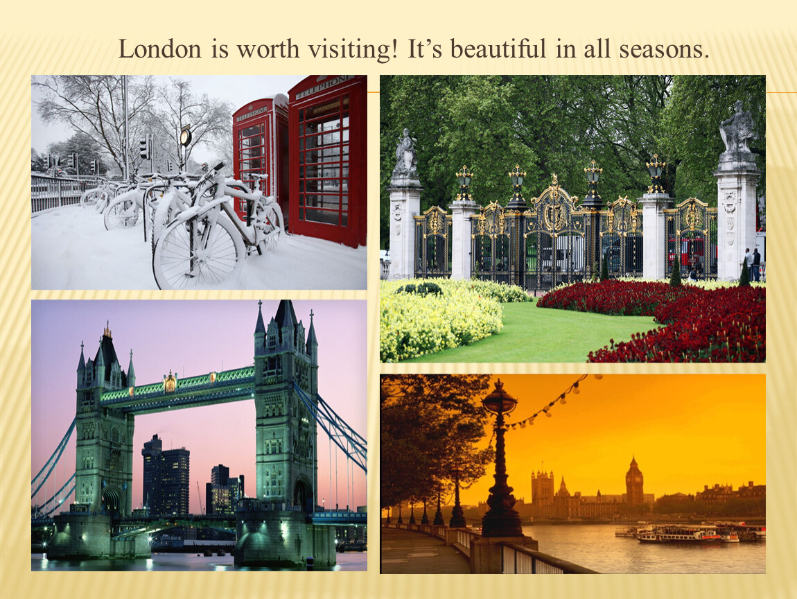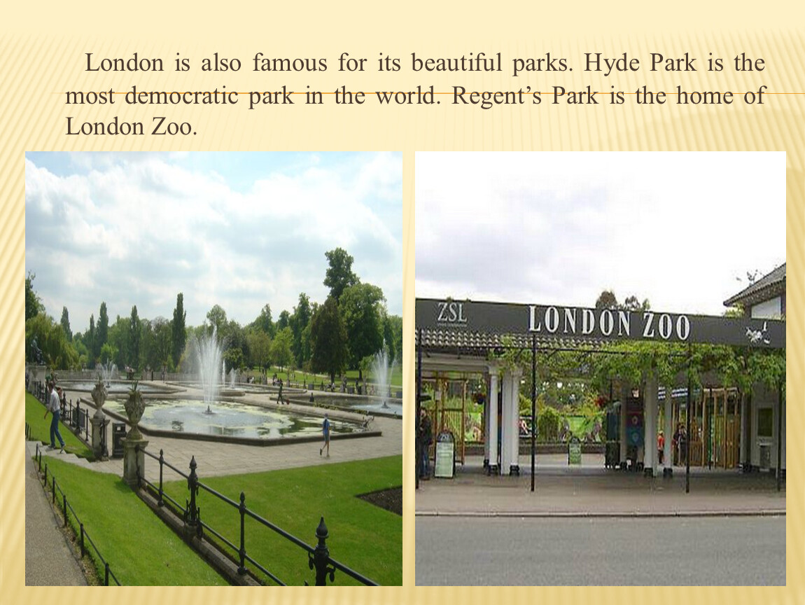 London is also famous for its beautiful parks. Hyde Park is the most democratic park in the world. Regent’s Park is the home of London Zoo.