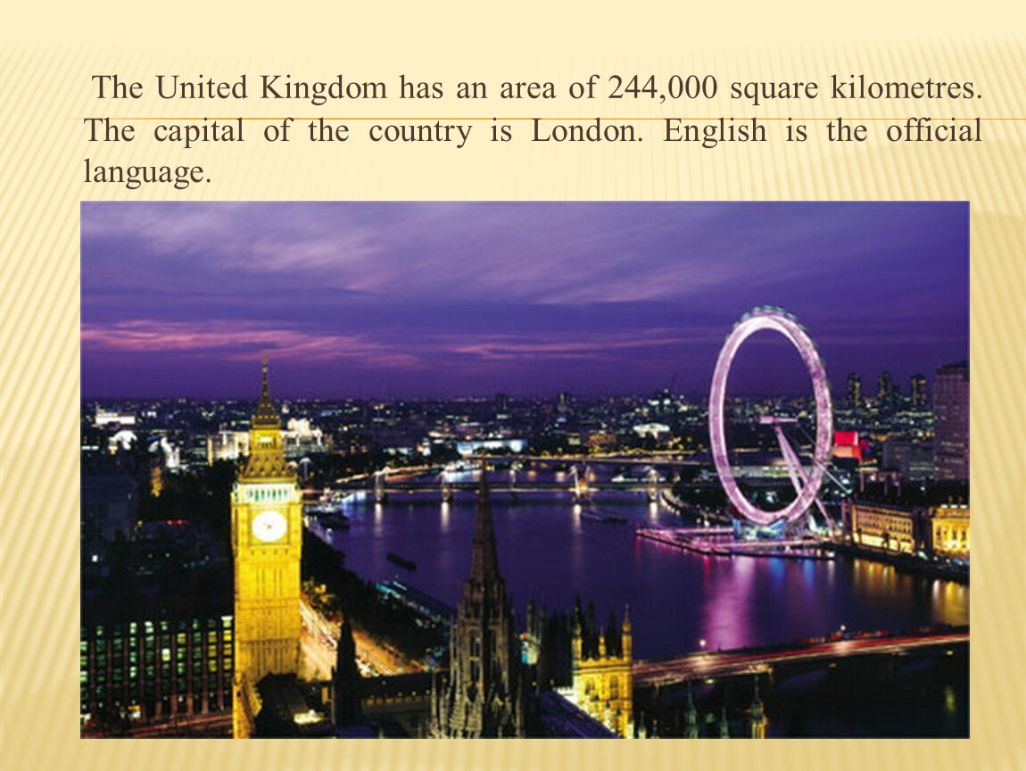 The United Kingdom has an area of 244,000 square kilometres. The capital of the country is London. English is the official language.