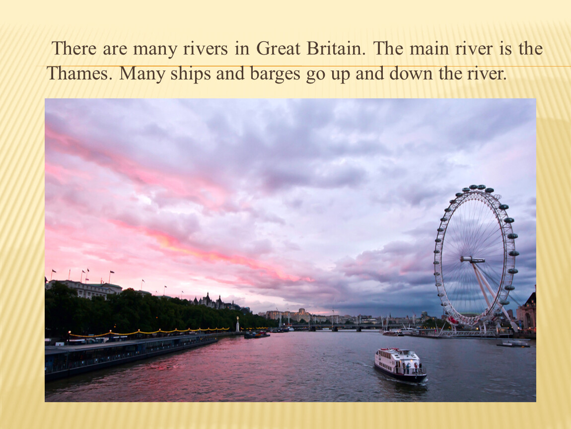 There are many rivers in Great Britain. The main river is the Thames. Many ships and barges go up and down the river.