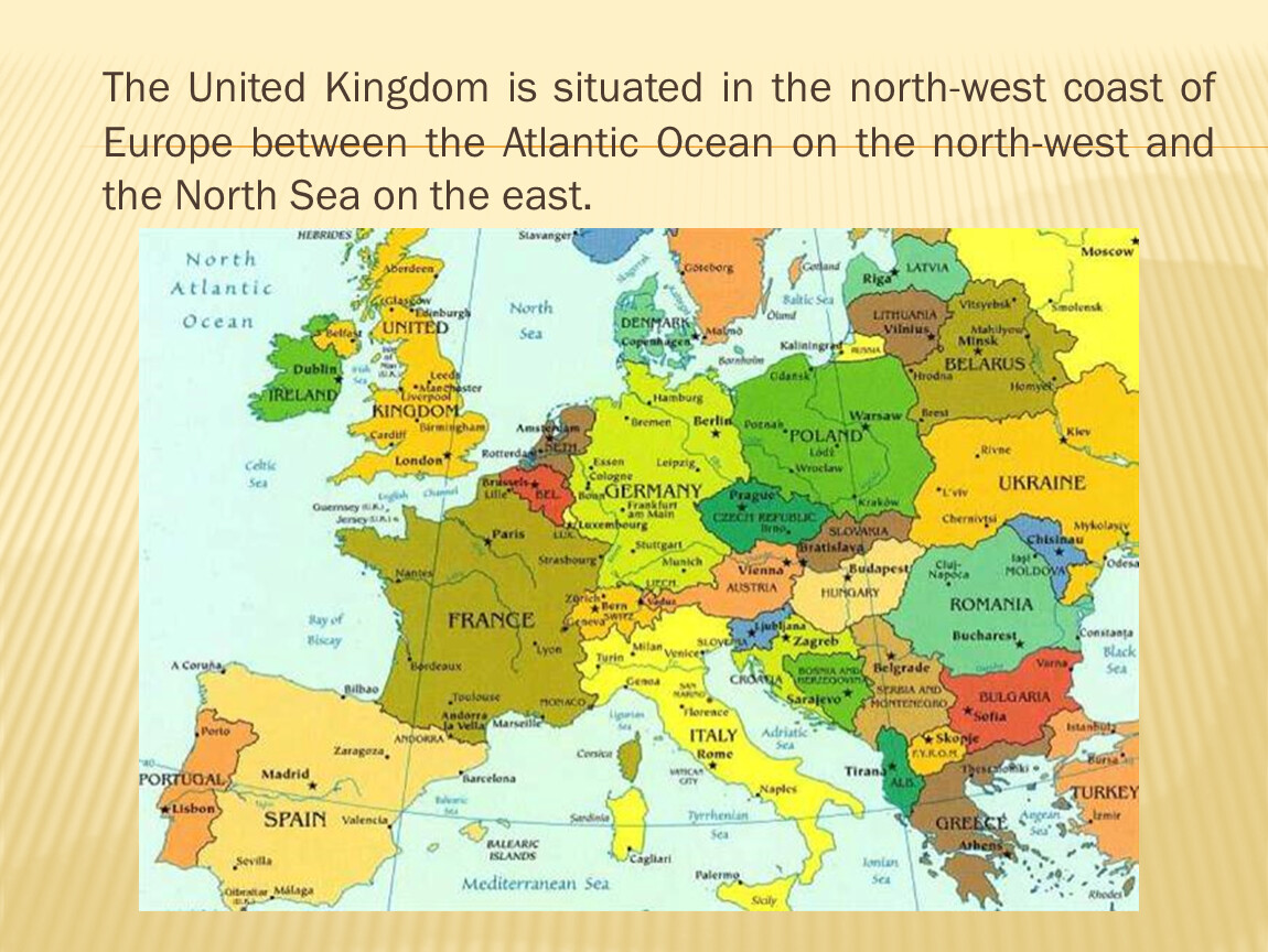 The United Kingdom is situated in the north-west coast of Europe between the Atlantic Ocean on the north-west and the North Sea on the east.