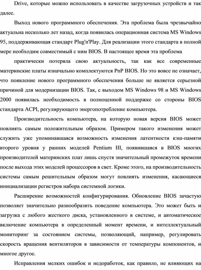 практически потеряла свою актуальность, так как все современные материнские платы изначально комплектуются PnP BIOS. Но это вовсе не означает, что появление нового программного обеспечения больше не является серьезной причиной для модернизации BIOS. Так, с выходом MS Windows 98 и MS Windows 2000 появилась необходимость в полноценной поддержке со стороны BIOS стандарта ACPI, регулирующего энергопотребление компьютера.