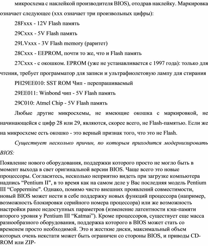 Определить тип микросхемы ПЗУ, установленной на материнской плате, несложно. Сразу следует сказать, что практически все материнские платы после 1997 года поставляются с Flash ROM, но если Вы не уверенны лучше проверить - для этого необходимо посмотреть на маркировку чипа ROM (28 или 32-контактная микросхема с наклейкой производителя BIOS), отодрав наклейку. Маркировка означает следующее (ххх означает три произвольных цифры):