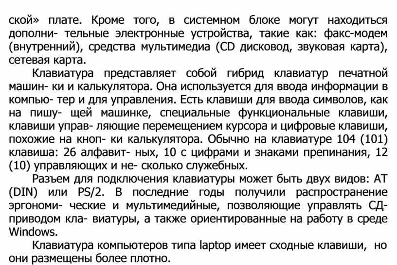 ской» плате. Кроме того, в системном блоке могут находиться дополни- тельные электронные устройства, такие как: факс-модем (внутренний), средства мультимедиа (CD дисковод, звуковая карта), сетевая карта.