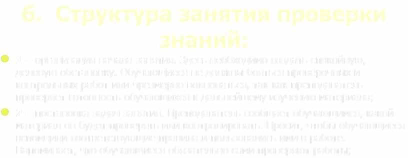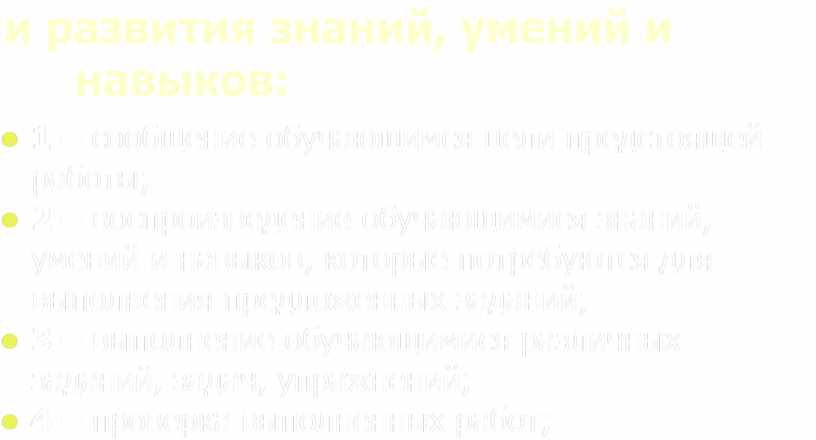 l 2 – постановка задач занятия. Преподаватель сообщает обучающимся, какой материал он будет проверять или контролировать. Просит, чтобы обучающиеся вспомнили соответствующие правила и пользовались ими в работе. Напоминает, что обучающиеся обязательно сами проверяют работы;