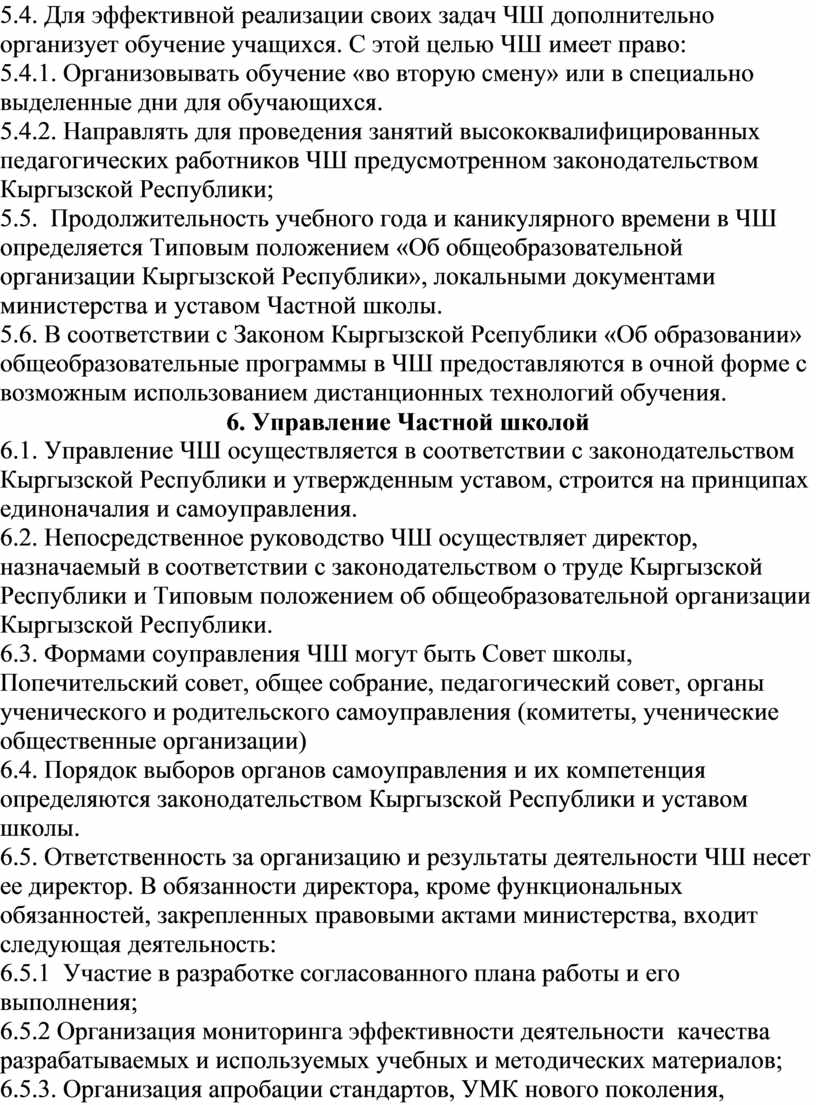 6.2. Непосредственное руководство ЧШ осуществляет директор, назначаемый в соответствии с законодательством о труде Кыргызской Республики и Типовым положением об общеобразовательной организации Кыргызской Республики.