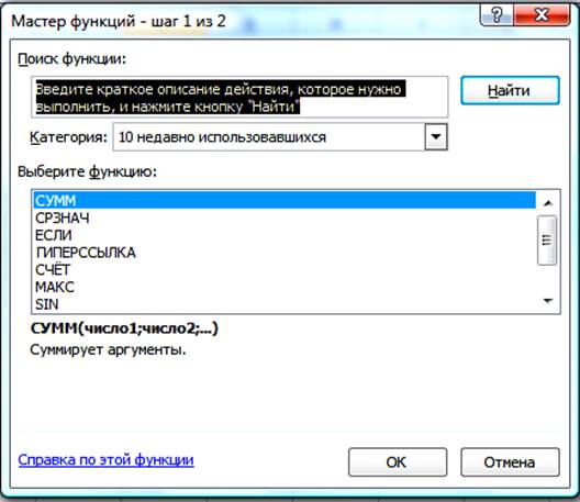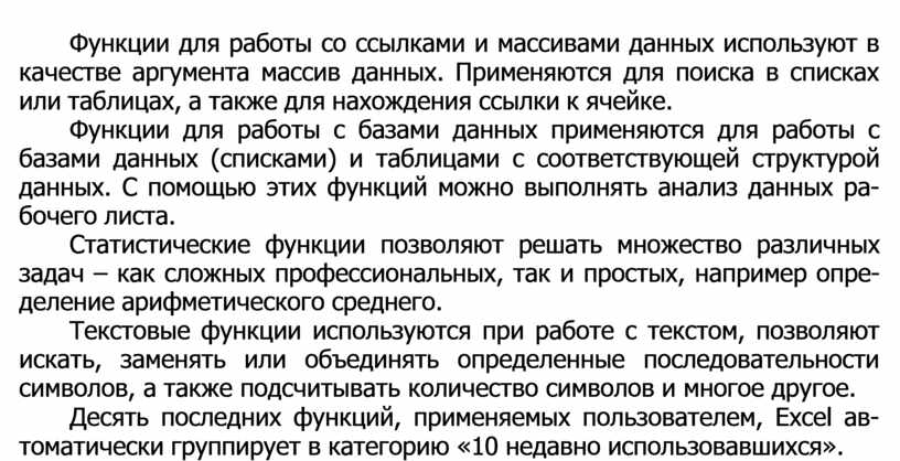 Десять последних функций, применяемых пользователем, Excel ав- томатически группирует в категорию «10 недавно использовавшихся».