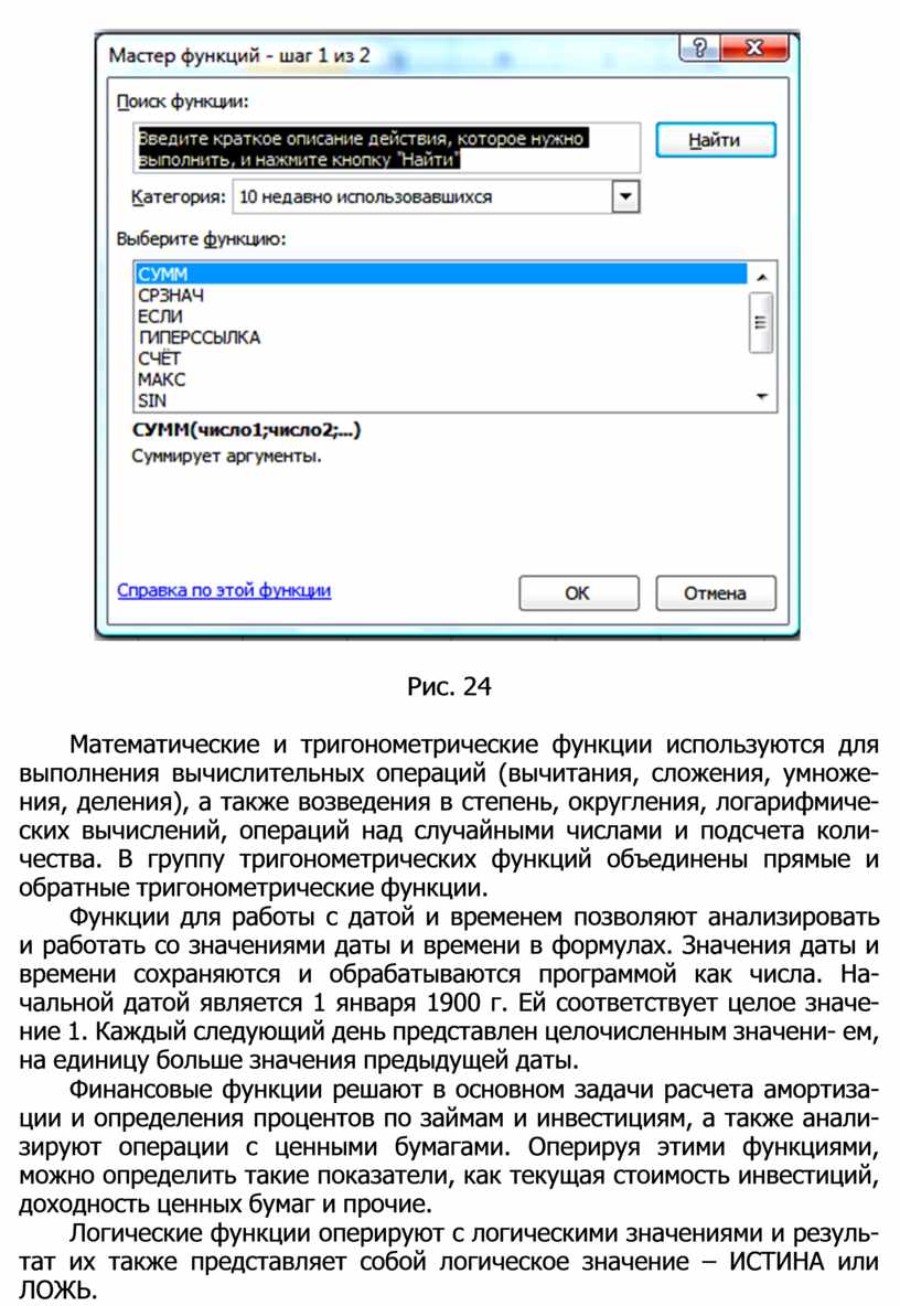 После выбора требуемой функции подключается Мастер функций, позволяющий пользователю пошагово заполнять ее аргументы (см. рис. 24).