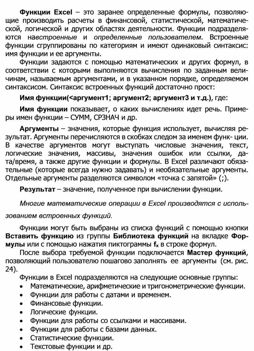 Функции могут быть выбраны из списка функций с помощью кнопки Вставить функцию из группы Библиотека функций на вкладке Фор- мулы или с помощью нажатия пиктограммы fx в строке формул.