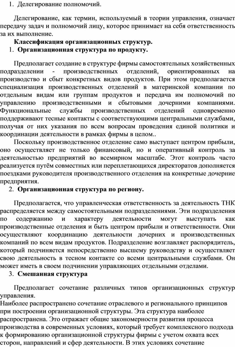 Предполагается, что управленческая ответственность за деятельность ТНК распределяется между самостоятельными подразделениями. Эти подразделения по содержанию и характеру деятельности могут выступать как производственные отделения и быть центром прибыли и ответственности. Они осуществляют координацию деятельности дочерних и производственных компаний по всем видам продуктов. Подразделение возглавляет распорядитель, который подчиняется непосредственно высшему руководству и осуществляет свою деятельность в тесном контакте со всеми центральными службами. Он может иметь в своем подчинении управляющих отдельными отделами.