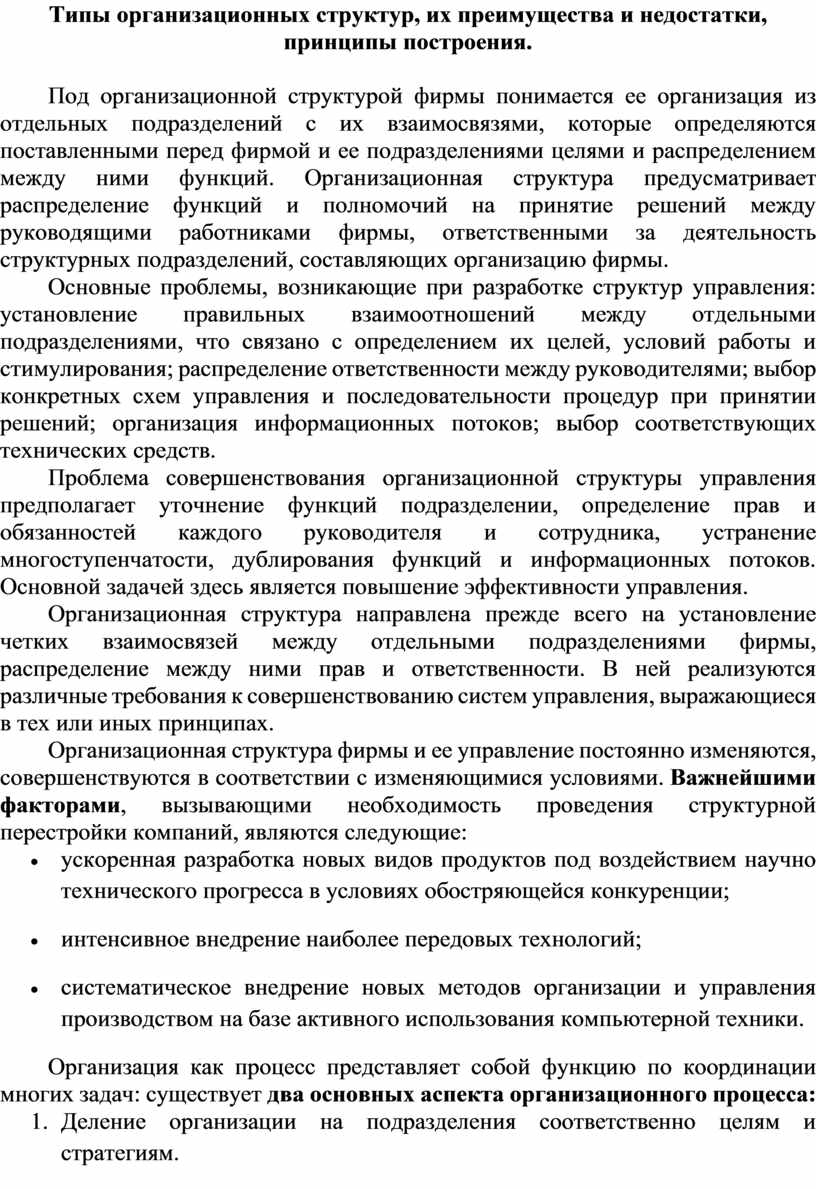 Типы организационных структур, их преимущества и недостатки, принципы построения.