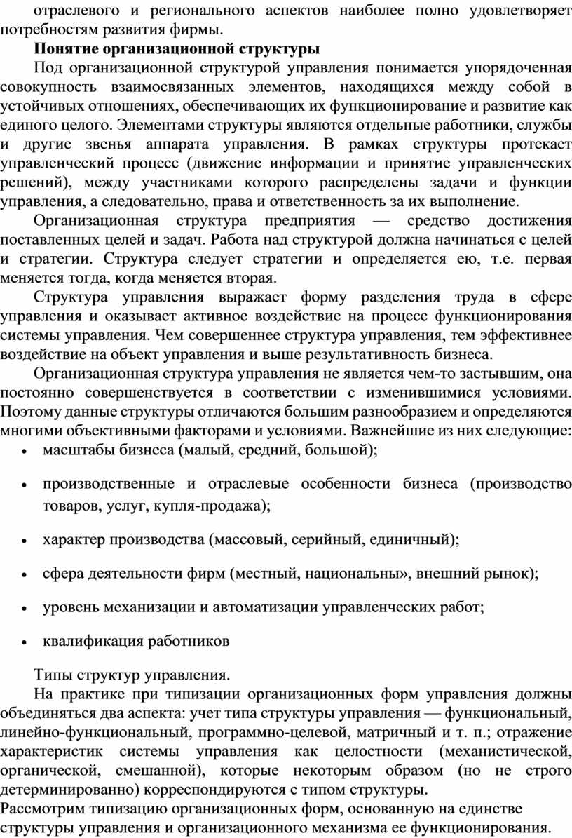 Под организационной структурой фирмы понимается ее организация из отдельных подразделений с их взаимосвязями, которые определяются поставленными перед фирмой и ее подразделениями целями и распределением между ними функций. Организационная структура предусматривает распределение функций и полномочий на принятие решений между руководящими работниками фирмы, ответственными за деятельность структурных подразделений, составляющих организацию фирмы.