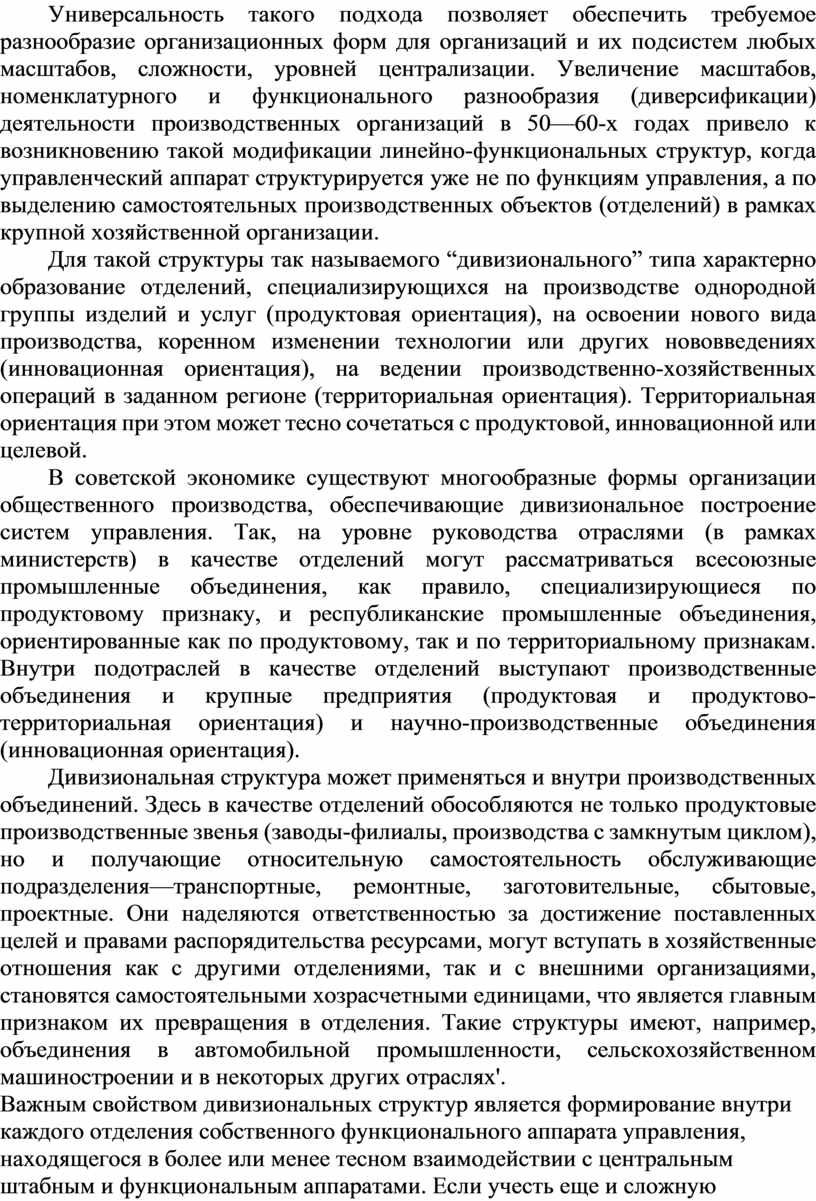 Дивизиональная структура может применяться и внутри производственных объединений. Здесь в качестве отделений обособляются не только продуктовые производственные звенья (заводы-филиалы, производства с замкнутым циклом), но и получающие относительную самостоятельность обслуживающие подразделения—транспортные, ремонтные, заготовительные, сбытовые, проектные. Они наделяются ответственностью за достижение поставленных целей и правами распорядительства ресурсами, могут вступать в хозяйственные отношения как с другими отделениями, так и с внешними организациями, становятся самостоятельными хозрасчетными единицами, что является главным признаком их превращения в отделения. Такие структуры имеют, например, объединения в автомобильной промышленности, сельскохозяйственном машиностроении и в некоторых других отраслях'.