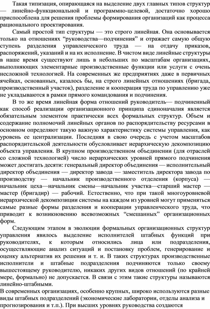 В то же время линейная форма отношений руководитель— подчиненный как способ реализации организационного принципа единоначалия является обязательным элементом практически всех формальных структур. Объем и содержание полномочий линейных органов по распорядительству ресурсами в основном определяют такую важную характеристику системы управления, как уровень ее централизации. Последняя в свою очередь с учетом масштабов распорядительской деятельности обусловливает иерархическую декомпозицию объекта управления. В крупном производственном объединении (для отраслей со сложной технологией) число иерархических уровней прямого подчинения может достигать десяти: генеральный директор объединения — исполнительный директор объединения — директор завода — заместитель директора завода по производству — начальник производственного отделения (корпуса) — начальник цеха—начальник смены—начальник участка—старший мастер — мастер (бригадир) — рабочий. Естественно, что при такой многоуровневой иерархической декомпозиции системы на каждом из уровней могут применяться самые разные формы разделения и кооперации управленческого труда, что приводит к возникновению всевозможных “смешанных” организационных форм.