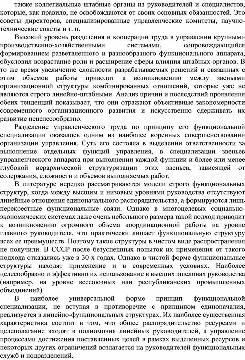 В наиболее универсальной форме принцип функциональной специализации, не вступая в противоречие с принципом единоначалия, реализуется в линейно-функциональных структурах. Их наиболее существенная характеристика состоит в том, что общее распорядительство ресурсами и целеполагание входят в полномочия линейных руководителей, а управление процессами достижения поставленных целей в рамках выделенных ресурсов и некоторых других ограничений возлагается на руководителей функциональных служб и подразделений.