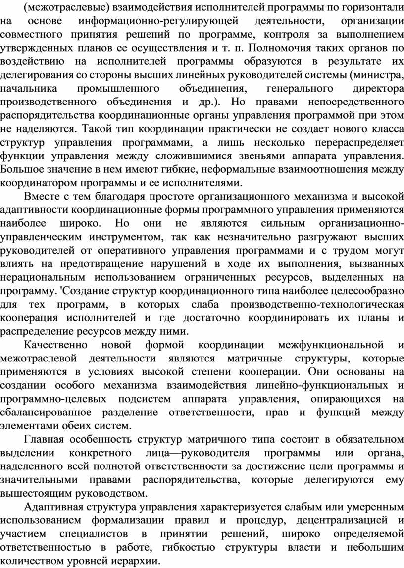 Вместе с тем благодаря простоте организационного механизма и высокой адаптивности координационные формы программного управления применяются наиболее широко. Но они не являются сильным организационно-управленческим инструментом, так как незначительно разгружают высших руководителей от оперативного управления программами и с трудом могут влиять на предотвращение нарушений в ходе их выполнения, вызванных нерациональным использованием ограниченных ресурсов, выделенных на программу. 'Создание структур координационного типа наиболее целесообразно для тех программ, в которых слаба производственно-технологическая кооперация исполнителей и где достаточно координировать их планы и распределение ресурсов между ними.
