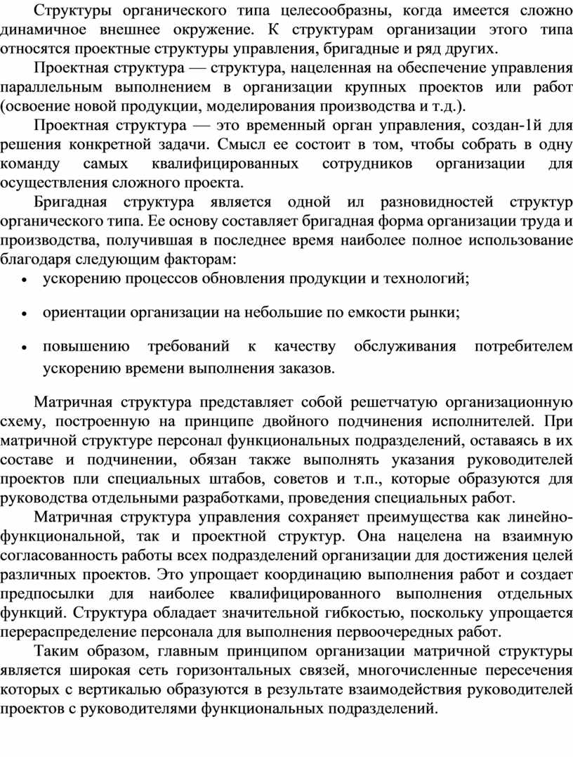 Структуры органического типа целесообразны, когда имеется сложно динамичное внешнее окружение. К структурам организации этого типа относятся проектные структуры управления, бригадные и ряд других.