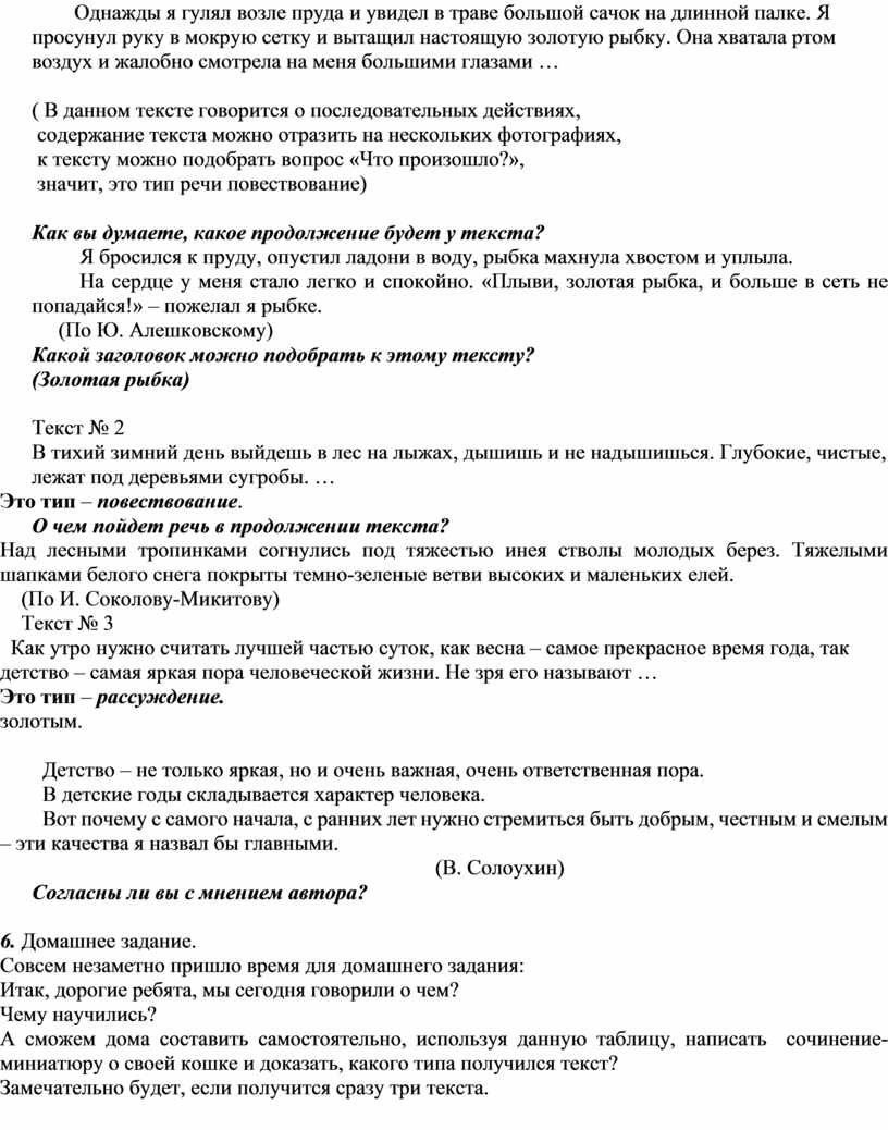 А сможем дома составить самостоятельно, используя данную таблицу, написать сочинение-миниатюру о своей кошке и доказать, какого типа получился текст?