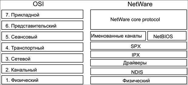 Рис. 43. Соотношение модели OSI и Novell NetWare