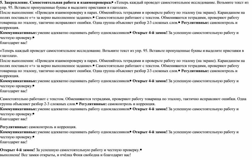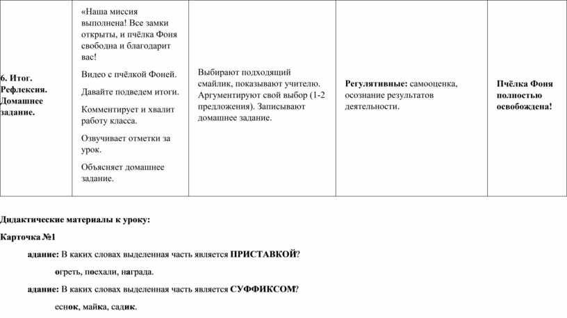 «Наша миссия выполнена! Все замки открыты, и пчёлка Фоня свободна и благодарит вас! Видео с пчёлкой Фоней. Давайте подведем итоги. Комментирует и хвалит работу класса. Озвучивает отметки за урок. Объясняет домашнее задание. |